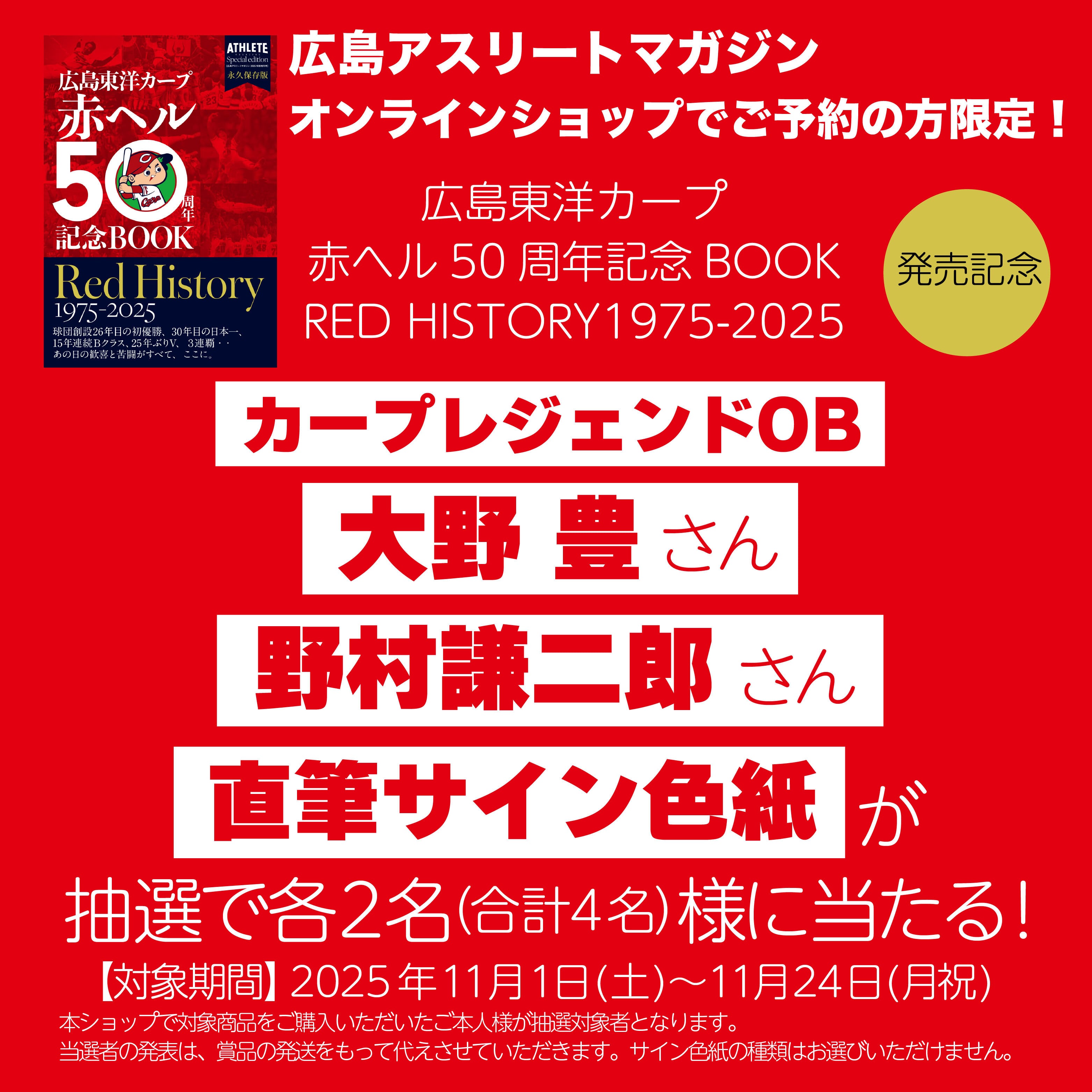 広島アスリートマガジンオンラインショップにて「広島東洋カープ赤ヘル50周年記念BOOK RED HISTORY1975-2025」を対象予約期間内にご予約いただいた方。